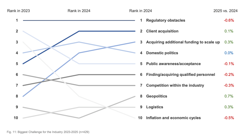 Let’s start with the bad news. Not only is drone industry funding sharply down from its 2021 peak, but drone companies are feeling the hit. A Drone Industry Insights survey of nearly 800 people in the drone industry, conducted in mid-2025, asked what the biggest challenges facing the industry in 2025 were.